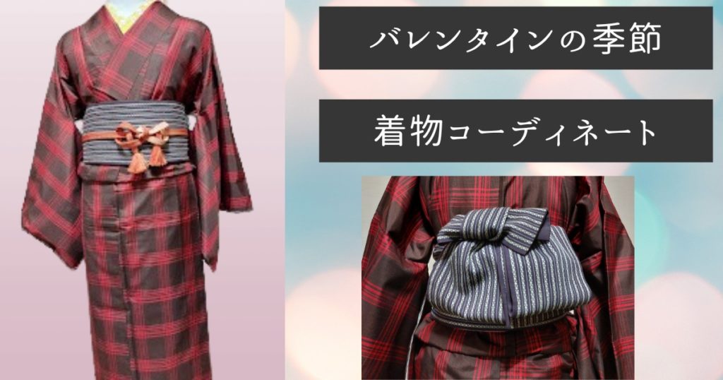 今回は茶色地に赤のチェック柄の着物にグレーの帯でバレンタインの季節を楽しむコーディネートを考えました。良かったらぜひ参考にしてください。
