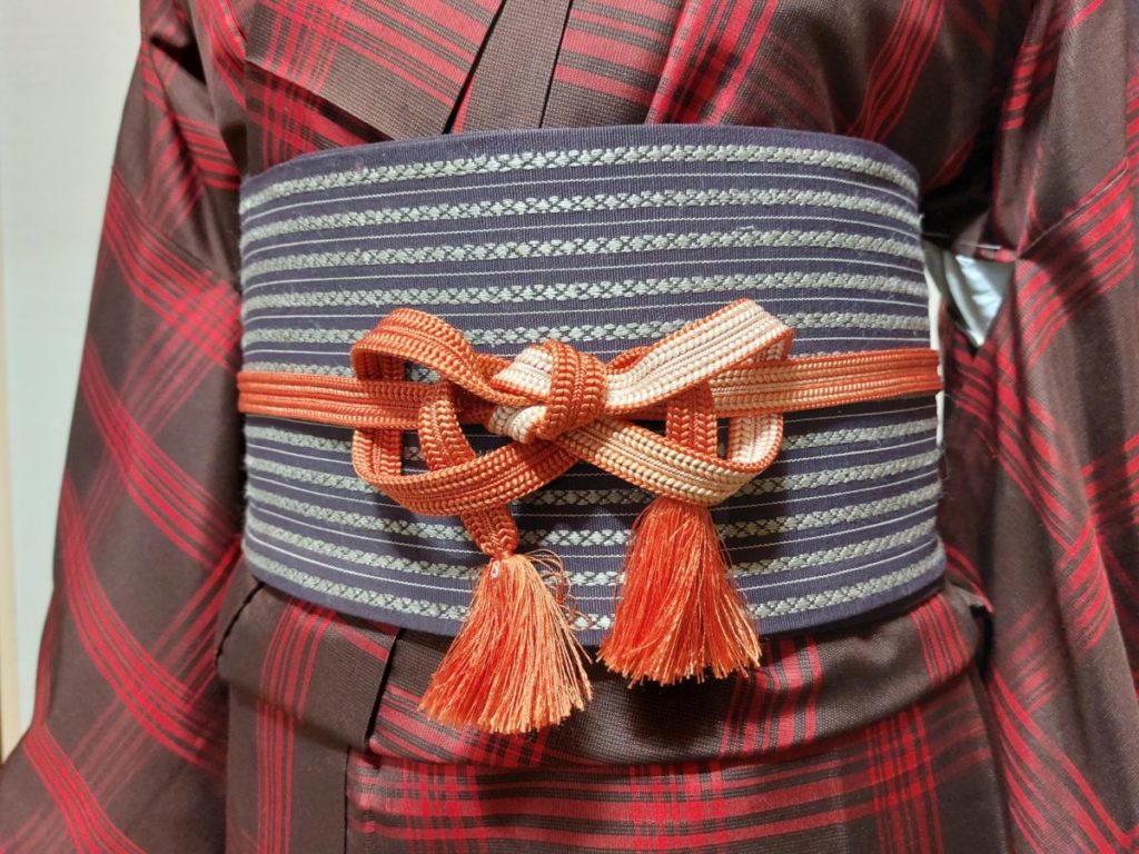 今回はバレンタインデーをイメージして茶色地に赤のチェック柄の本場大島紬を選びました。そしてシックな半幅帯に朱色系の帯締めです。