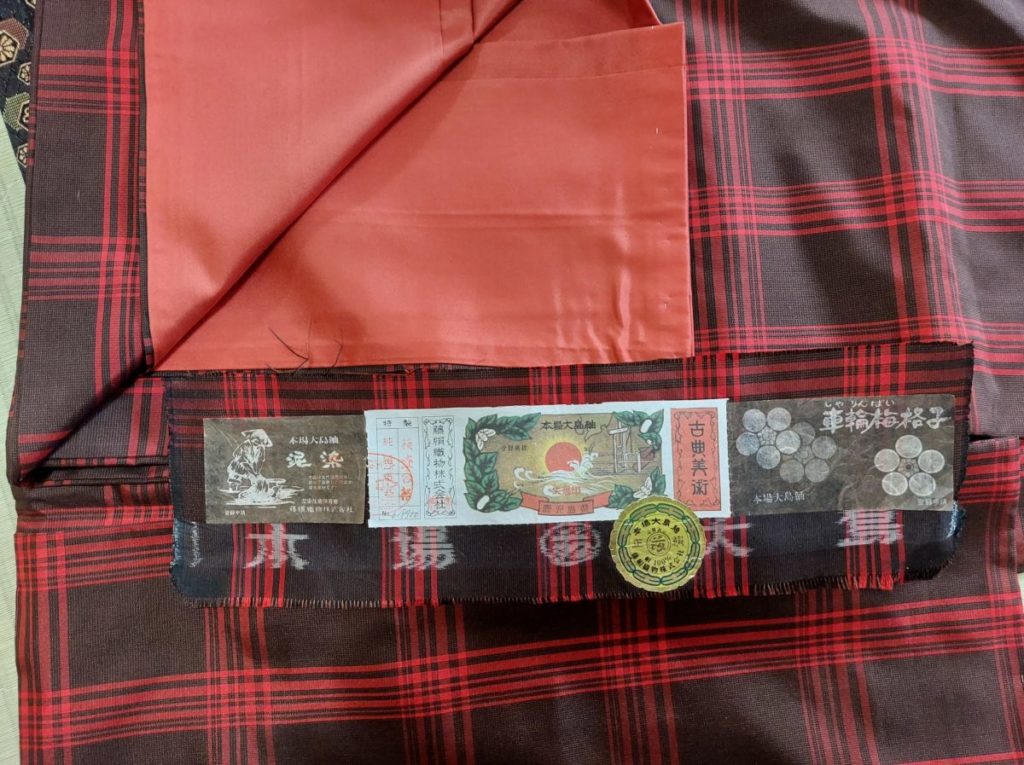 チョコレート色って、焦げ茶色ってことです😁もちろん茶色でもいいです。今回は茶色地に赤のチェック柄の本場大島紬を選びました。