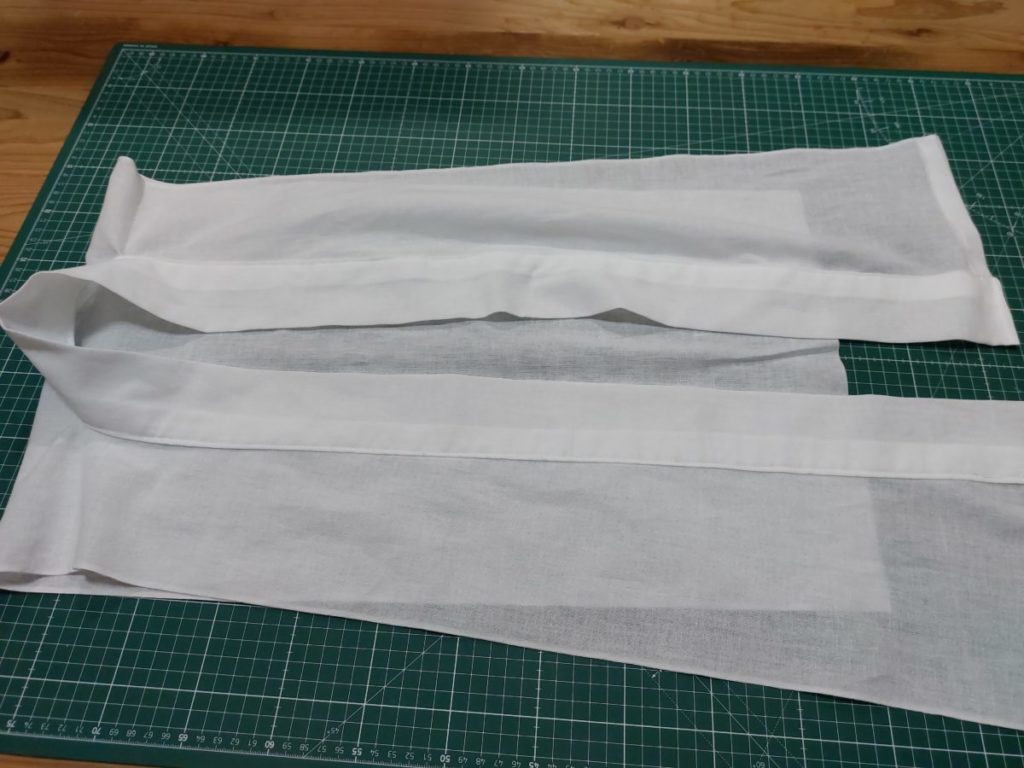 次に衿の作り方です。150cmに切ったさらしをそのまま使ってもいいですし、半分の幅で使ってもいいそうです。