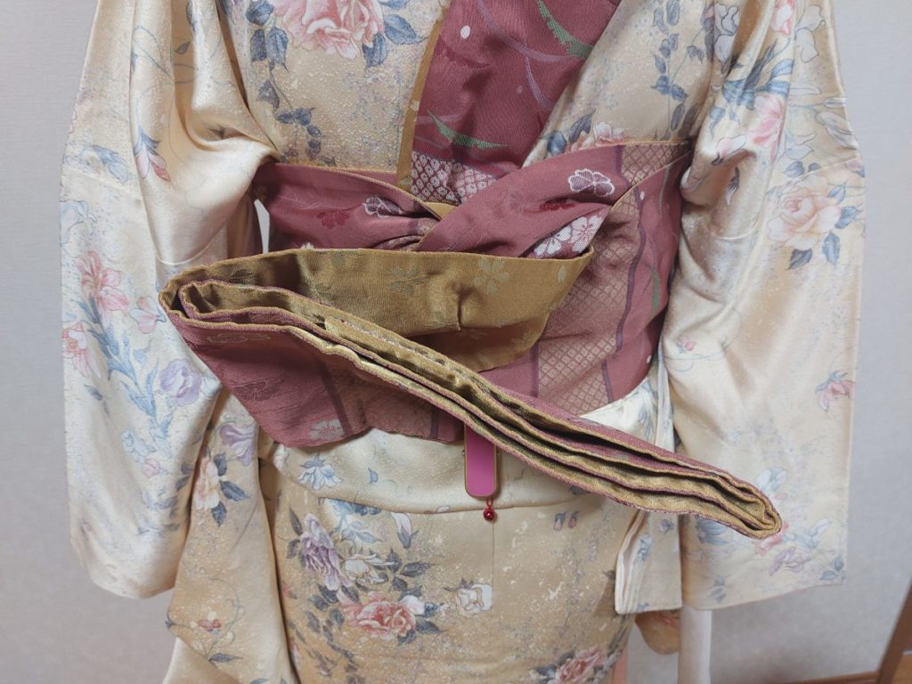 5 残った手先はくるくる丸めて帯の中に収納します。これが帯結びの枕代わりになります。そして、帯が持ち上がるんです。ほら、4のときは下を向いていた羽が、ぐっと持ち上がりました。