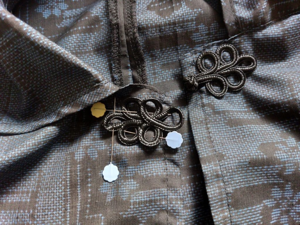 今回は、本場大島紬のロングベストにチャイナボタンを合わせたいと思います。大島紬によく似合いそうな黒の輪が5、6個あるボタンをつけてみることにします。