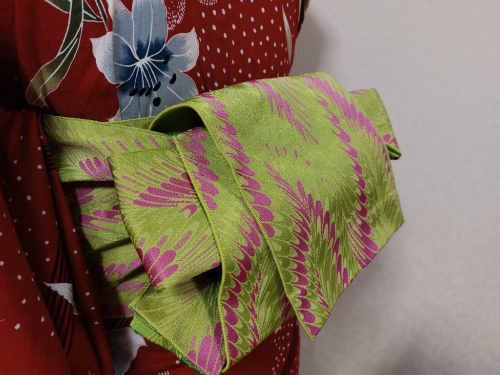 帯の長さでいろいろにアレンジの効く帯結びです。両面使える帯だったら、上から出ているたれが動くたびに揺れます。羽にひだを作ったことで、いつものかるたむどの羽にどちらの柄を見せるかで、雰囲気が変わってきます(‘-‘*)