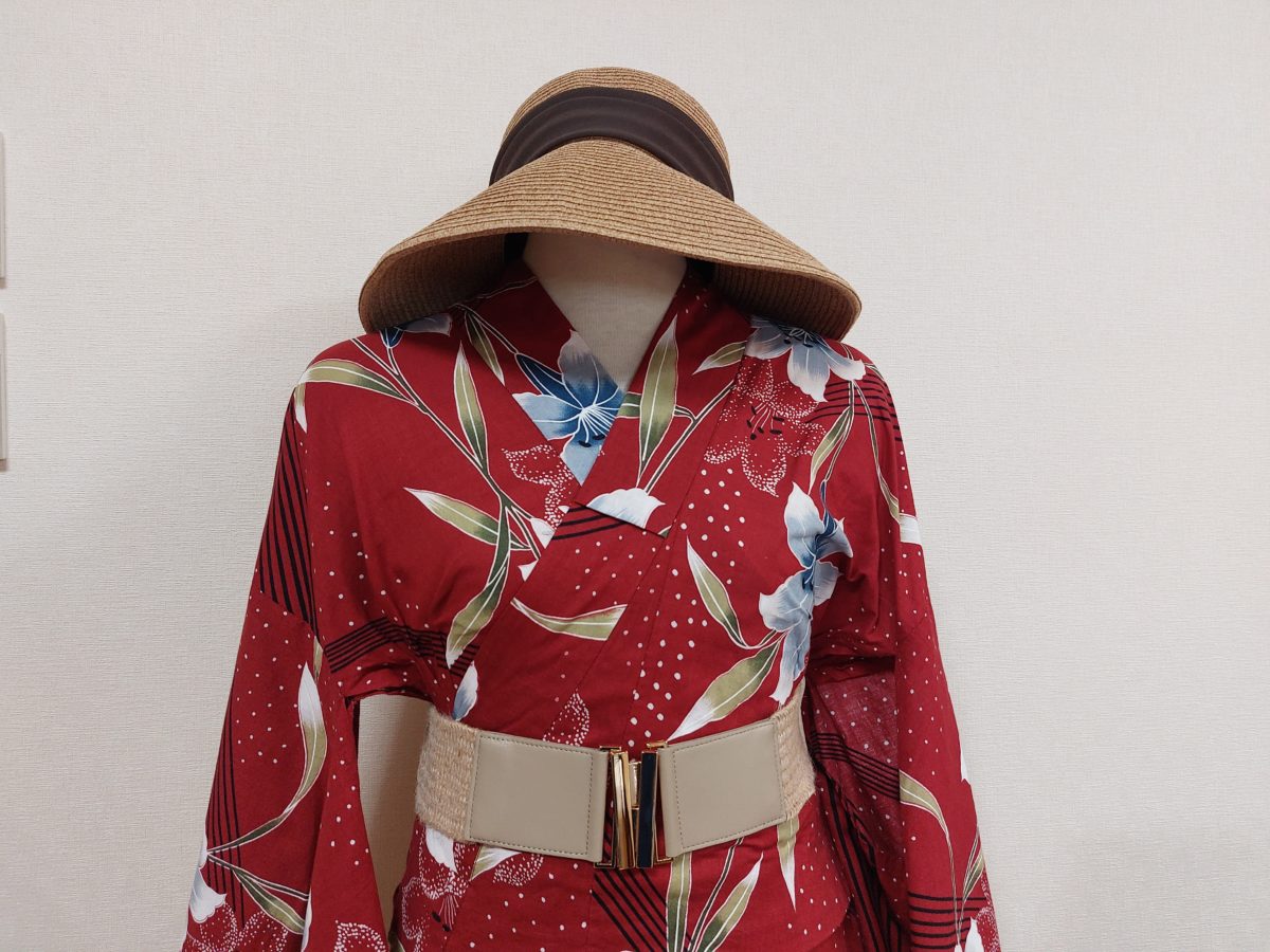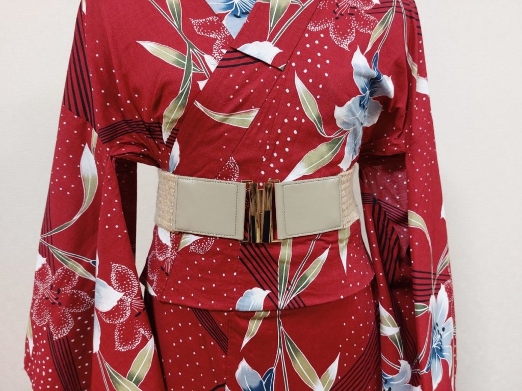 帯をベルトに変えるだけで浴衣感がずいぶん抜けます。ベルト次第では、和物の洋服みたいな感じになります。